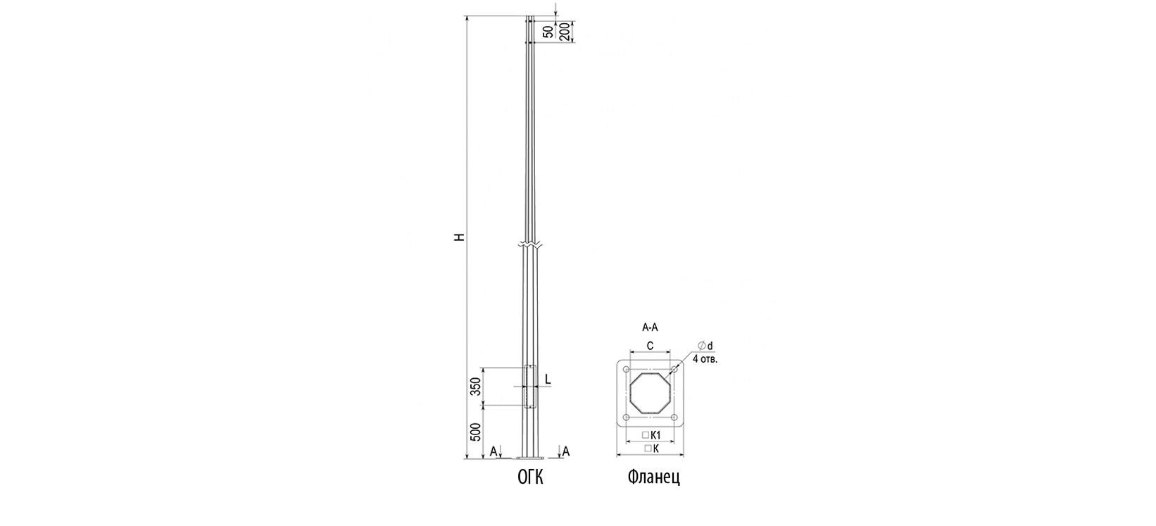 Ствол опоры ОГК 8-гранный, конический выполнен из стального листа толщиной 3-4 мм. В нижней части имеет фланец для крепления с фундаментом. Опора имеет больший диаметр у своего основания, и меньший – в верхней части.